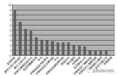 如表6所示,其中(zhong)網絡設(shè)備(bei)公(gōng)司有(yǒu)華爲(wei)、中(zhong)興、烽火通(tong)信(xin);運營(ying)商(shang)有(yǒu)中(zhong)國(guo)電(dian)信(xin)、中(zhong)國(guo)移動(dòng)、中(zhong)國(guo)聯(lian)通(tong);大(da)學(xué)有(yǒu)清(qing)華大(da)學(xué)、北京郵(you)電(dian)大(da)學(xué)、北京交通(tong)大(da)學(xué)、浙江(jiang)工(gong)商(shang)大(da)學(xué);網絡公(gōng)司有(yǒu)阿裏巴巴、亞信(xin)科(ke)技(ji);研究機(jī)構有(yǒu)電(dian)信(xin)傳(chuan)輸(shu)研究所、中(zhong)國(guo)信(xin)息通(tong)信(xin)研究院、中(zhong)國(guo)科(ke)院計(ji)算所;網絡資(zi)源注冊機(jī)構有(yǒu)中(zhong)國(guo)互聯(lian)網信(xin)息中(zhong)心;政府機(jī)構有(yǒu)中(zhong)國(guo)信(xin)息技(ji)術(shù)标委(wei)會。中(zhong)國(guo)髮(fa)表RFC數(shu)量以(yi)及(ji)平均RFC引用(yong)數(shu)量的(de)分(fēn)布如圖1咊(he)圖2所示。